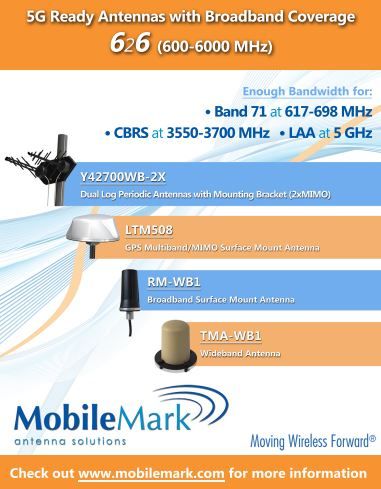 Mobile Mark now offers antenna solutions that provide wideband coverage from 600-6000 MHz. 5G is the newest generation of cellular network technology. There is a fast growing interest for antennas that can cover the entire “6-2-6” frequency band, from 600-6000 MHz. These antennas make it possible to connect to any of the current or planned cellular frequency bands that reside at or below 6 GHz.